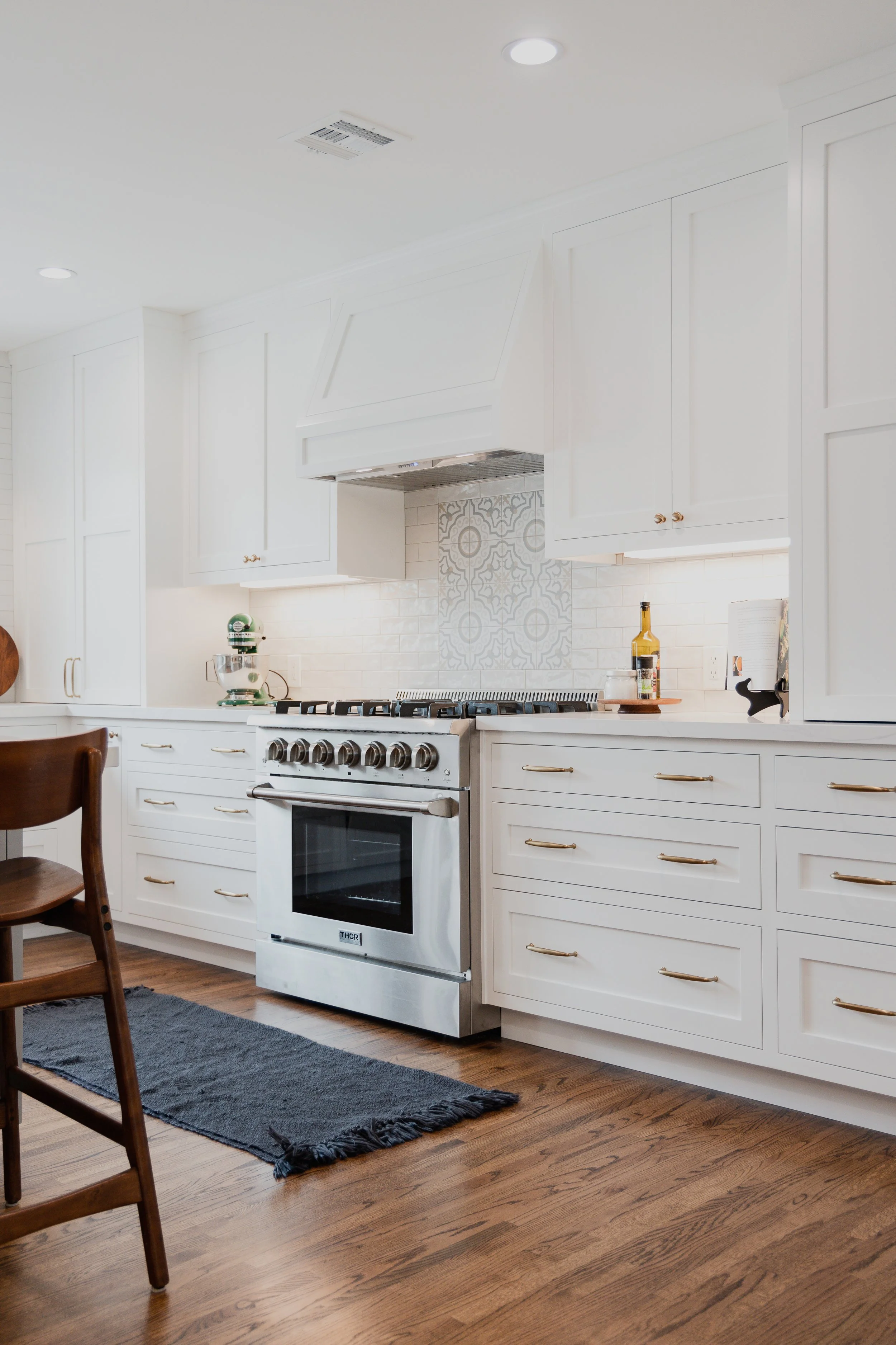Inspired by a traditional yet modern aesthetic, the design combined white subway tiles in the kitchen backsplash and shower, herringbone marble tile surrounding the fireplace, and hexagon tile to add a modern flare. Custom cabinetry was built, installed, and painted by the team, which included specialty appliance garages with pocket doors, a floor-to-ceiling pantry with pull-out shelves, full extension glides, and soft-close hinges to maximize accessibility, and a custom panel for the dishwasher to conceal the appliance and create an elegant finished look. The cabinets were finished with a lacquer finish to ensure durability and longevity.